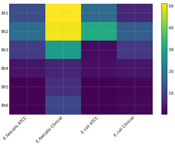 Fig. 2: Heatmap of Bt1–Bt6 Bioactivity Against Clinical and ATCC Strains of E. faecalis and E. coli.