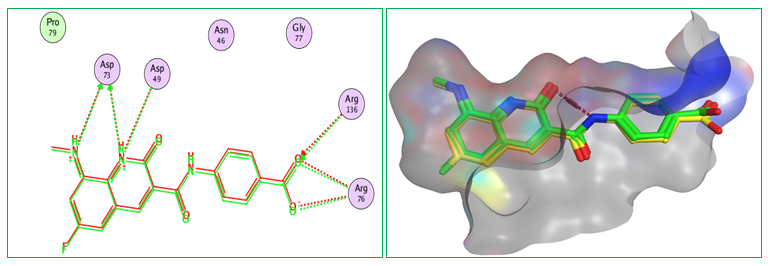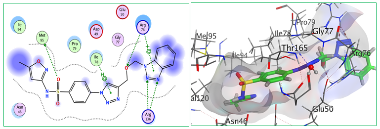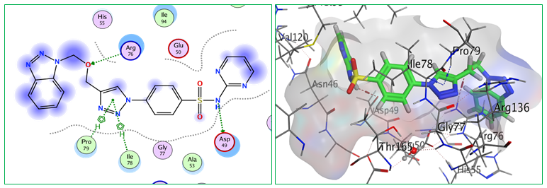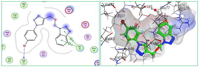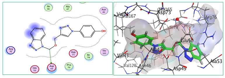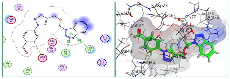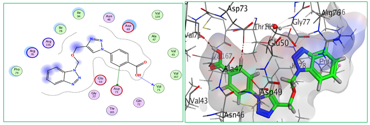 Figure 3 indicates the redocking of the native co-crystallized ligand into the protein’s active site 7C7N to validate the docking protocol. An RMSD of 0.1324 Å was obtained for the redocking, indicating an excellent fit between predicted docking pose and the crystallographic conformation. The very small deviation between crystallographic pose (green) and redocked pose (red) indicates good correspondence of docking protocol and crystallographic binding mode. Importantly, the redocked ligand retained key interactions with major active site residues, including Asp49, Asp73, Pro79, Asn46, Gly77, Arg76, and Arg136, through a combination of hydrogen bonding and electrostatic contacts. The preservation of these conserved interactions suggests that the docking parameters and scoring function employed in this study realistically represent the physicochemical environment of the active site of protein 7C7N. The capacity of this protocol to reproduce binding orientation and key interactions, significantly supports the reliability and robustness of our setup. Hence low RMSD and conservation of interactions in some critical residues stimulate confidence in our method for the docking studies of designed benzotriazole–triazole derivatives.