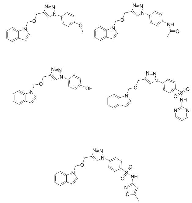 4-(4-(((1H-benzo[d](1,2,3-triazol-1-yl)methoxy)methyl)-1H-1,2,3-triazol-1-yl)-N-(5-methylisoxazol-3-yl)benzenesulfonamide (Bt6):pale-white solid, Yield:69 %, mp 241-243 °C; IR (cm−1), 3263 (N–H stretch of sulfonamide), 3114(C-H of triazole ring), 3072 (aromatic C–H stretching, aromatic rings), 1579 (aromatic C=C); 1H NMR data δ 11.22 (s, 1H, N-H), 8.36 (s, 1H, triazole-H), 7.91-7.18 (m, 13H, Ar-H), 6.11(s, 1H, CH, isoxazole), 5.83 (s, 2H, CH₂ attached to triazole), 4.70 (s, 2H, CH₂ linked to benzotriazole), 2.31(s, 3H, CH3 attached to isoxazole), ; 13C NMR data δ 169.24, 156.54, 96.87 (3C, C5, C3 and C4 of isoxazole ring), 142.98,118.91(2C, C4 and C5 of triazole ring), 144.87, 139.68, 137.79, 135.28, 129.65, 127.87, 124.29, 121.75, 120.55, 112.27, (10C, of aromatic carbons), 73.78 (1C, CH₂ attached to triazole), 58.61 (1C, CH₂ linked to benzotriazole), 13.14 (1C, CH3 linked to isoxazole).