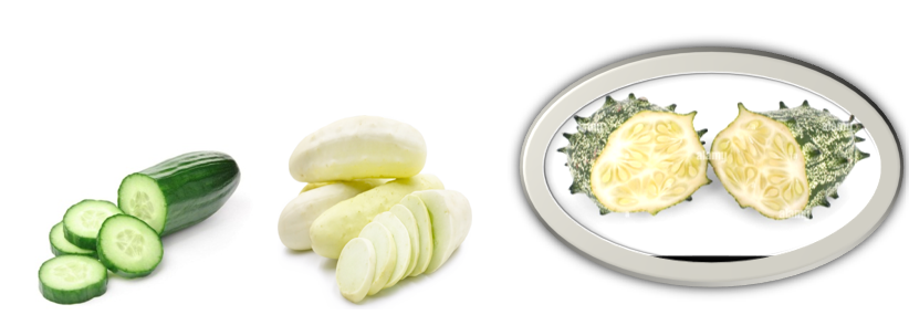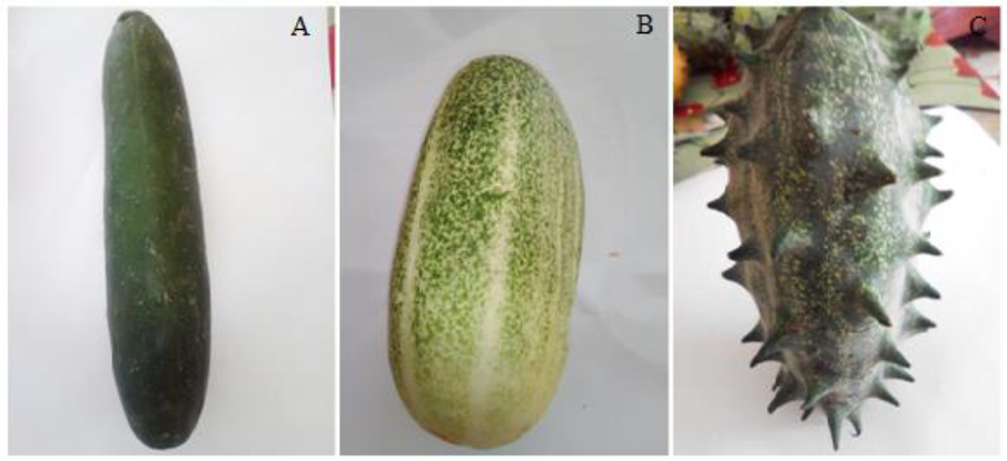 A= Green cucumber, B= white cucumber,  C= African horned cucumber