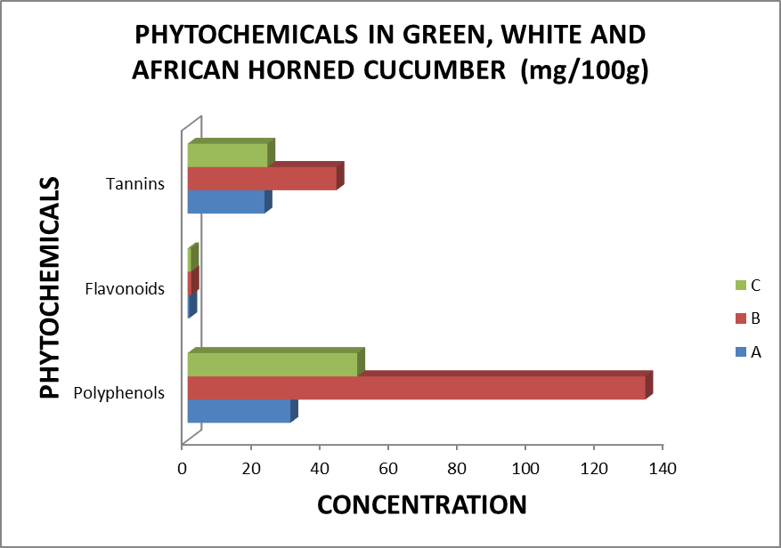 Proximate and phytochemical analysis on cucumber fruit samples showed a relatively high          proportion of humidity and sugars, a moderate concentration of polyphenols, proteins, and   tannins, and a slightly present of ash and flavonoids. For vitamins and minerals, highconcentrations of N and  K, and moderate and slight concentrations of Mg, Na, Ca, and Fewere recorded. The high humidity of the whole cucumber (C. sativus and C. metuliferus) fruitvarying between 89 and 96.4% was recorded [6, 19-21]. Cucumber is a rich source of importantnutrients and bioactive compounds; it has been used not only as food but also in therapeuticmedicine and as an ornamental plant [22-24].Cucumber considered a fruit and vegetable crop is rich in polyphenolics and otherphytochemicals [19]. Uthpala [25] have conducted aphytochemical screening on cucumber (C. sativus) homogenate samples and they have foundthat relatively higher amounts of steroids, terpenoids, glycosides, and resins are present incucumber while moderate amounts of saponins, alkaloids, and flavonoids have been reported. Quantitative amounts of the proximate and phytochemicals found reducing sugars in thehighest amount (574.4mg/g) relatively compared to other phytochemicals followed bypolyphenols (8.51 mg/g), flavonoids (2.14 mg/g), and tannins (1.26 mg/g) were the lowestavailable phytochemicals [19]. The analytical composition of C.metuliferus  showed  proteins, lipids, sugars, and minerals includingmagnesium with high concentration, calcium, potassium, and iron; vitamin C whichconcentration is four times higher in lemon [26-27]. Thephytochemicals present in the fruit of C. metuliferus revealed the presence of usefulsecondary metabolites such as alkaloids, Flavonoids, saponins, tannins, steroids, andterpenoids [28-30].Comparing the proximate and phytochemicals between varieties, green C. sativuscontented more humidity and proteins than white C. sativus and African horned cucumber.White C. sativus contained significantly more polyphenols, flavonoids, tannins, and sugarsfollowed by non-bitter C. metuliferus. For the acidity and ash, the higher values wererecorded in non-bitter C. metuliferus. For vitamin C and minerals (N, Mg, Ca, K and Fe),there was no significant variation between varieties. But more vitamin C, Mg, and Ca wererecorded in non-bitter C. metuliferus followed by white C. sativus while higher K, Fe, and Nawere recorded respectively in white and green C. sativus. The humidity of the whole fruit ofcucumber varied from 89% for C. metuliferus and 96.4% for C. sativus [6,19- 21, 31].