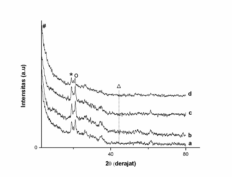 Impregnation of Cr on pillared ZrO2-bentonite will decrease basal spacing from peak with d001 characteristic and expand 2θ. The characteristic of peak of Cr metal (JCPDS card No 06-06394) lays on d110 (Fig. 1). The pillarization process can increase basal spacing of bentonite that reflects the success of pillarization process; however the exceeding impregnation process of Cr metal can lower back its basal spacing (Table.2). This can happen because as the impregnation process, the previously established pillars will fall along with the increasing amount of Cr.