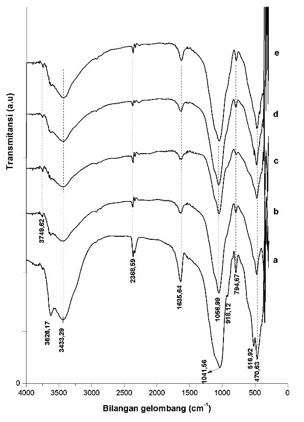 Fig. 2. FTIR spectra of HF Bentonite catalyst (a), ZrO2-bentonite (b), Cr/ZrO2B-1 (c), Cr/ZrO2B-2 (d) and, Cr/ZrO2B-3 (e)