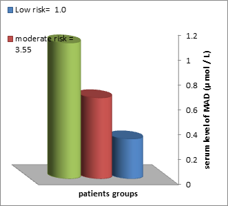 The patients group demonstrated a gradual increase of MAD level (0.32 ± 0.12 0.65± 0.19M and 1.09±0.23μ mol / L, respectively) in the three groups of Atherosclerosis. Such difference was significant (P ≤ 0.05), and the r value (0.59) of correlation was also positively significant (P ≤ 0.01) as shown in table 4 and figure (3 and 4)