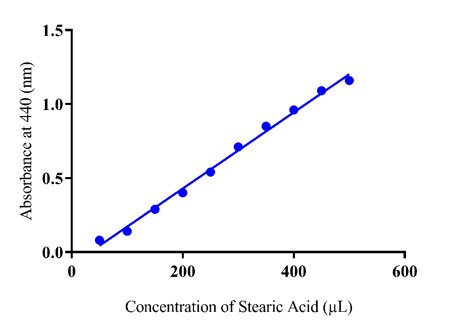 The lipolytic activity are the attributor of lipases and phospholipases enzymes so evaluation of the activity was made by monitoring the enzymes activities and stabilities at various temperature, pH and solvents. Prior to take the absorbance of liberated fatty acids of prunus species a standard curve plot drown of different concentrations of stearic acid (Fig. 1) .The selection of stearic acid made due to stability and easily availability according to local climate and environment. Previous work reported the successfully use of stearic acid while other fatty acid (oleic acid) also found as the control reagent for enzymatic studies 14.