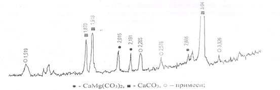 The X-ray picture permitted to identify such minerals as dolomite (d = 2,898; 2,191; 2,015; 1,785 Å), calcite (d=3,038; 2,09; 1,874 Å) and silica (d=3,343; 1,813; 1,539 Å).