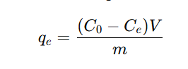 The adsorption capacity, qeq_eqe (mg/g), was calculated using: