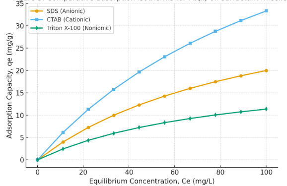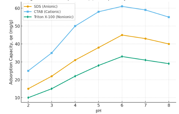 Among the three surfactants, CTAB exhibited the highest adsorption capacity due to strong electrostatic interactions with Pb(II) ions. SDS showed moderate adsorption via ion exchange and electrostatic repulsion mechanisms, while Triton X-100 exhibited the lowest adsorption capacity, relying mainly on hydrogen bonding and van der Waals interactions.