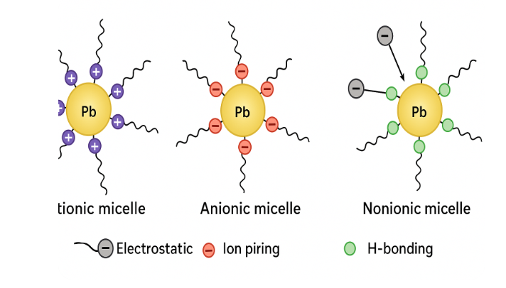 Figure 4 : Adsorption mechanism of Pb(II) on cationic, anionic, and nonionic micelles.