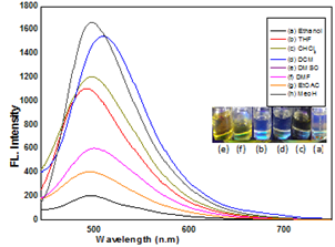 When the spectroscopic band occurs in the UV visible part of the spectrum solvatochromism is observed as a change of color and the behavior of MAP in various protic and aprotic solvents. For this purpose, the absorption spectra of the MAP are measured in eight various solvents at a concentration 10–4 mol. Fluorescence emission spectra of MAP in ethanol shows emission maxima at 490–500 nm which demonstrates blue shift. MAP shows red shift in various solvents (CHCl3, DMF, DCM and EtOAC ). The maximum wavelength of absorption and emission for (MAP) are summarized in Table 1. In UV region chloroform, DCM, ethanol and THF, ethyl acetate emits the blue color and DMF, DMSO gives yellow color. The less number of carbonyl group in MAPH affects the extent of their interaction with the solvent, thus weakening the absorption and emission.