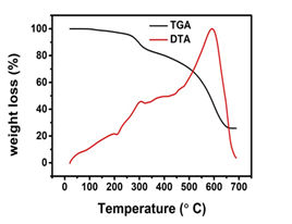 The thermal behavior of the homopolymer (MAPH) was studied. Samples (10 mg) were placed in a crucible and heated up to 800 °C at a rate of 10 °C/min in inert nitrogen with Al2O3 as a reference material. The TG–DTA of the polymer (MAPH) was studied; herein, we only show the curves of the polymer decomposition process (in Fig.9.). The polymer has very good thermal stability up to 200 °C with the endothermic peak at 200 °C. The weight loss occurs due to the liberation of CO2 molecules in the temperature range of 200 °C to 300 °C. In the next stage, the weight loss of in the temperature range of 301 °C to 600 °C was due further liberation of CO2. On further heating, the complete decomposition of polymer occurs at 700 °C.23, The presence of appreciable peak around 100°C in the DTA analysis shows the presence of water molecules in the polymer.