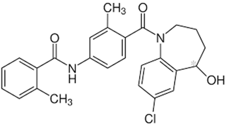 Tolvaptan is a white, crystalline compound that forms prism-shaped crystals. Its molecular formula is C₂₆H₂₅ClN₂O₃, with a molecular weight of 448.94 g/mol. It has a melting point between 220°C and 226°C and a pKa of 7.4. Tolvaptan is practically insoluble in water, slightly soluble in ethanol, soluble in methanol, and readily dissolves in benzyl alcohol. It acts as a selective vasopressin V2-receptor antagonist, primarily used to slow kidney function decline in patients at risk of rapidly progressing autosomal dominant polycystic kidney disease (ADPKD). It is also effective in treating hypervolemic and euvolemic hyponatremia.