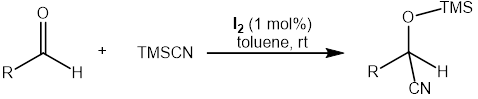 In conclusion, simple iodine serves as an efficient catalyst for the cyanosilylation of a broad range of aldehydes in toluene at room temperature. Key advantages include high catalytic efficiency with minimal catalyst loading, mild reaction conditions, wide substrate applicability, and excellent conversion rates.