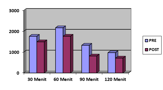 The bacterial concentration threshold was set at 700 CFU/m³. Although the exhaust fan operated for 30, 60, and 90 minutes, bacterial levels remained above this threshold. Only after 120 minutes did the bacterial concentration approach the threshold, suggesting that exhaust fan usage alone could not fully reduce bacterial levels below the limit, likely due to human activity and occupancy, as reported by Fox (2013), Mahyuddin (2013), and Meadow (2014). CO₂ levels were also found to correlate with microorganism concentrations. While outdoor air quality had an effect, human presence contributed nearly twice as much to indoor microorganism levels.