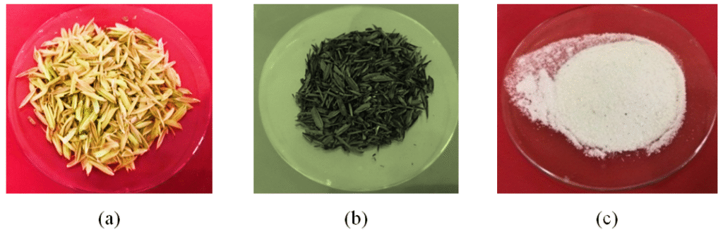 Figure 1. Raw RH sample (a), RHA sample (b), and the resulting nanosilica (c).