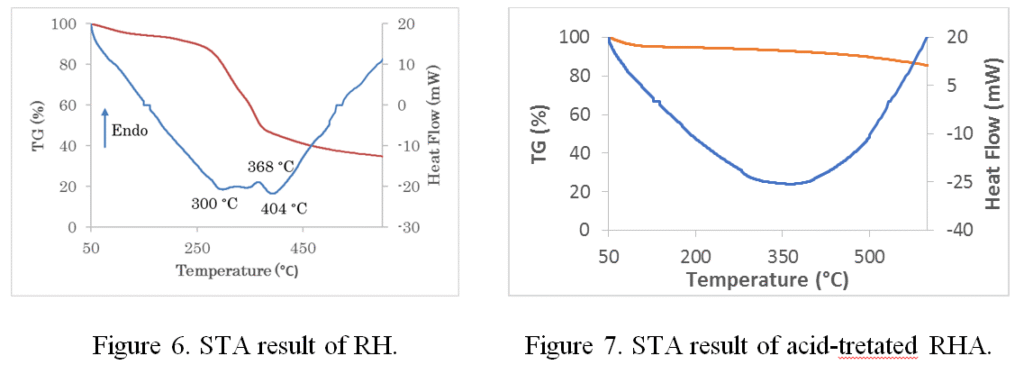 The temperature has an important role during the synthesis process of nanosilica from RH. In order to observe the effect of temperature on the formation of nanosilica, we applied STA technique for two samples RH and acid treated RHA. Figure 6 shows STA result of RH sample that exhibited drastically loss of mass about 60% at temperature about 300 °C. This might be caused by adserbed water and other molecules were evaporated. The heatflow graph showed the exothermic reaction at 300 °C due to adsobed water was evaporated while endothermic reaction occurred at 368 °C might be caused by the burning of carbon contaminants. Another exothermic reaction was observed at 404 °C which indicated the phase transformation and amorphous nanosilica started to form.