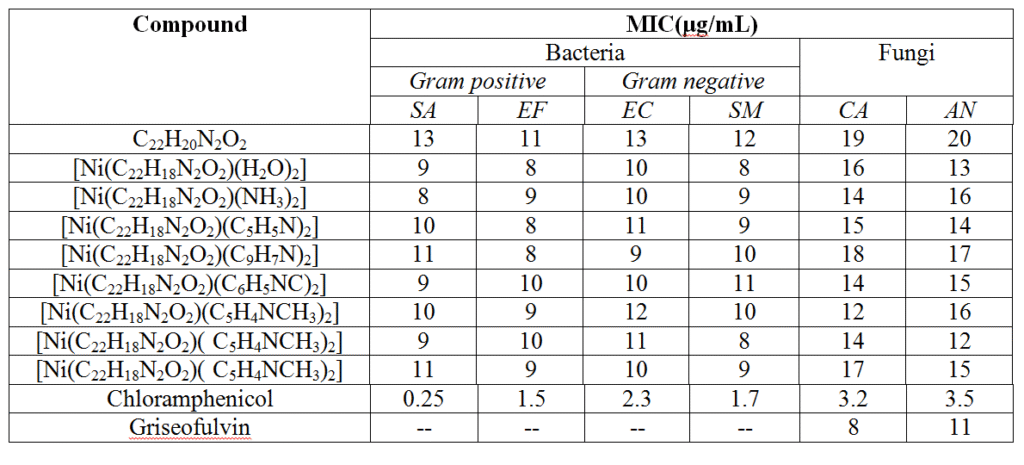 The antibacterial and antifungal activities of the studied ligand and its Ni(II) complexes were evaluated using the disc diffusion method. The in vitro antibacterial activity was tested against two Gram-positive bacteria, Staphylococcus aureus (SA) and Enterococcus faecalis (EF), and two Gram-negative bacteria, Escherichia coli (EC) and Staphylococcus mutans (SM). Antifungal activity was assessed against Candida albicans (CA) and Aspergillus niger (AN). Chloramphenicol and griseofulvin were used as standard reference drugs for bacteria and fungi, respectively, at the same concentrations under identical conditions.