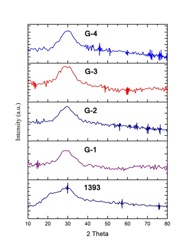 3.1 X-Ray analysis of bioactive glasses The XRD patterns of the base glass and the SiO₂-replaced samples with boron trioxide (B₂O₃) in the 1393 bioactive glass are presented in Figure 1. The results confirm the amorphous nature of the glass, as evidenced by the absence of sharp peaks, indicating no crystalline phases are present. A broad hump is observed in the 2θ range of 25° to 35°, which becomes more pronounced with increasing B₂O₃ content. This is the only noticeable change across the different patterns and indicates that boron trioxide (B₂O₃) is completely incorporated into the glass matrix