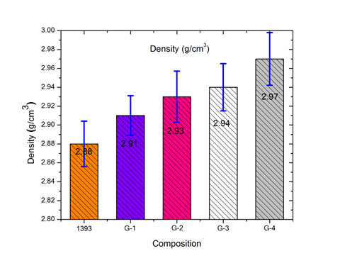 Figure 2- Density of 1393, G-1, G-2, G-3 and G-4 glass samples