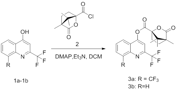 Compounds 3a and 3b were both prepared at the lab of Academy of Science and Technology, Chuxiong Normal University.The 2-trifluoromethyl-4-hydroxyquinoline or 2,8-ditrifluoromethyl-4-hydroxy quinoline (1, 1.0 mmol), Et3N (1.1 mmol) and DMAP (0.2 mmol) were dissolved in CH2Cl2 (10 mL) and cooled in ice bath, to which the (1S)-(-)-camphanic acid acyl chloride intermediate (2,1.1 mmol) was added separately. The mixture was reacted at room temperature for 1~3 h. When the reaction was completed, the organic phase was washed with water, dried and evaporated to give the crude product, which was purified by silica gel chromatography (CH2Cl2/MeOH = 20:1, v:v) to afford 3a–3b.