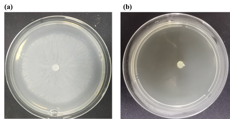 Fig. 2. Mycelium growth and extension of S. sclerotiorum after treatment with different concentrations of compound 3a on agar medium: (a) 0 mg/L; (b) 50 mg/L.