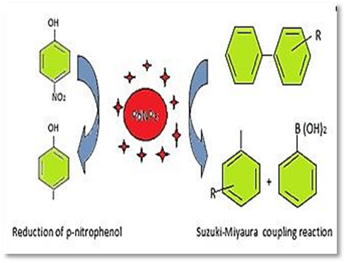 The process of catalysis involves employing a spatial substance called a catalyst to speed up the reaction. For catalysis to occur, the chemical compound must be absorbed on the surface of the material extremely quickly and desorb slowly [47]. Nanoscale materials have higher catalytic activity. As the size of the nanoparticles decreases, the catalytic activity rises. At their bulk scale, noble metals are inert and regarded as subpar catalysts. However, noble metals at the nanoscale are very effective catalysts [48]. For example, the developed palladium nanoparticles from fenugreek tea were tested as a hydrogenation catalyst for 4-nitrophenol, which demonstrated strong catalyst activity, as an illustration of the functional features. Additionally, palladium nanoparticles from fenugreek tea are employed as catalysts in the Suzuki-Miyaura coupling process in place of the conventional palladium complexes to produce biphenyl with outstanding yields [49, 50].