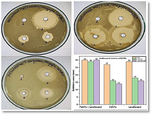 Significant action against antifungal and antibacterial organisms was shown by these greenly produced palladium nanoparticles from Rosa damascena leaf extract. Examine the toxic activity of palladium nanoparticles on E. coli (gram-negative) and Staphylococcus aureus during the 24-hour test period. Candida albicans, Aspergillus niger, and Aspergillus flavus were all successfully eradicated by the palladium nanoparticles, showing remarkable antifungal activity, as shown in Fig. 2 [76] [77]. It has been demonstrated that the antibacterial effects of palladium nanoparticles reflect their dimension. It was discovered that palladium nanoparticles are still more harmful to gram-positive Staphylococcus aureus bacteria than palladium ions. Palladium nanoparticles with a diameter of 2 nm or less were more hazardous than those with a diameter of 2.5 or 3.1 nm. The highest antifungal activity, even against fungi, was seen for the diameters of 200, 220, and 250 nm in the green production and characterization of palladium nanoparticles using flavonoids derived from quercetin. Palladium nanoparticles created from the fruit extract of Couroupita guianensis were tested at a dose of 25 mg/ml, and they demonstrated remarkable antimicrobial application even against gram-positive and gram-negative microorganisms [78]. Additionally, the substance successfully combated a brand new drug-resistance diagnostics microbial culture of Cronobacter sakazakii variety AMD04 while exhibiting outstanding antibacterial and anti-biofilm applications. Palladium nanoparticles were shown to have minimal bactericidal and prohibitive concentration MIC and MBC of 0.06 and 0.12 mm, respectively [79]. The antibacterial and antifungal application of the phyto-synthesized palladium nanoparticles against Candida albicans and Bacillus subtilis has been shown. Palladium ions were mixed with leaf extract of Santalum album in a 9:1 ratio and left to set at ambient temperature for four days to produce the palladium nanoparticles. The generated round-shaped palladium nanoparticles ranged in size from 10 to 40 nm on average. In comparison to gram-positive bacteria, nanoparticles demonstrated more powerful antibacterial action against gram-negative bacteria [80].